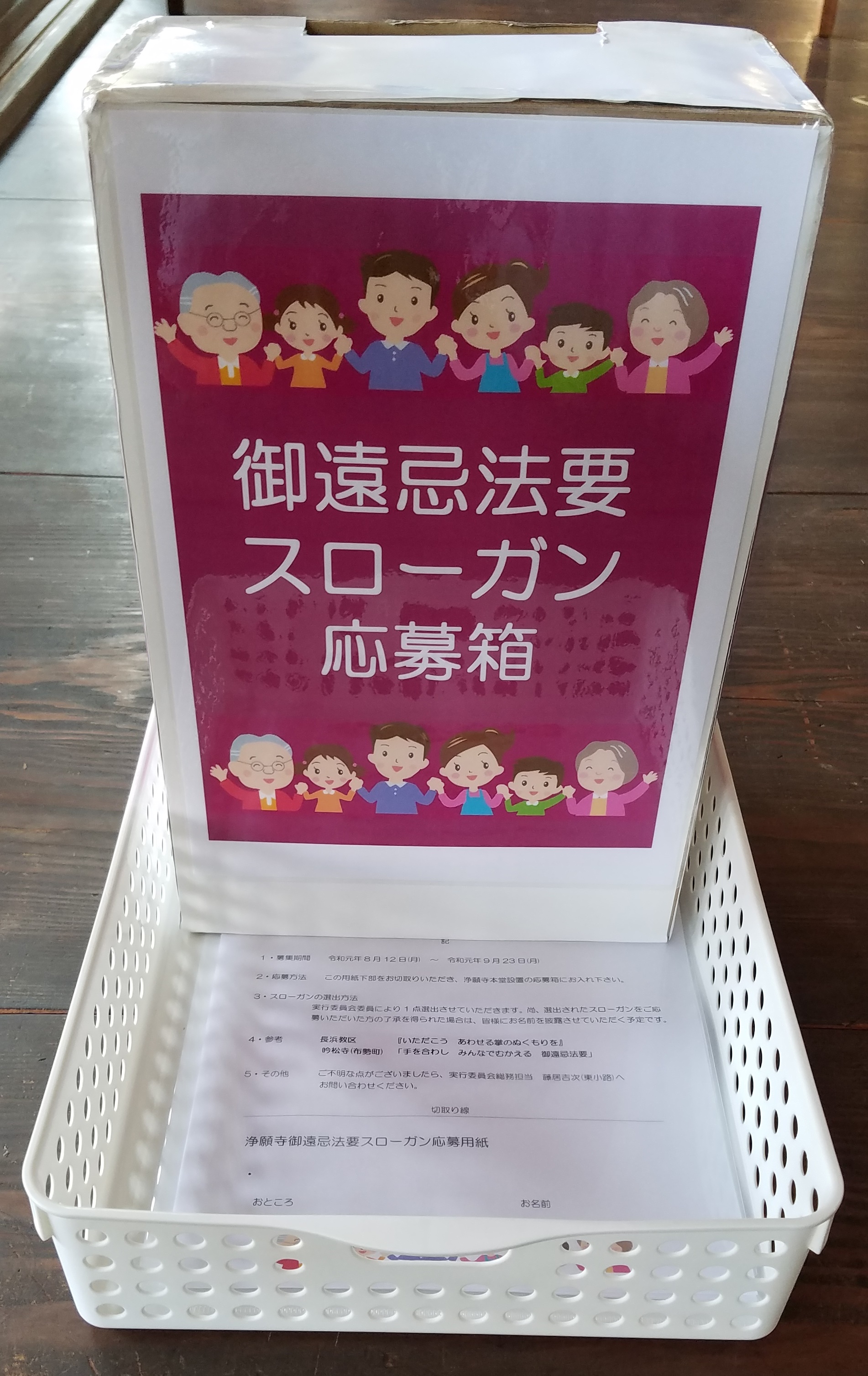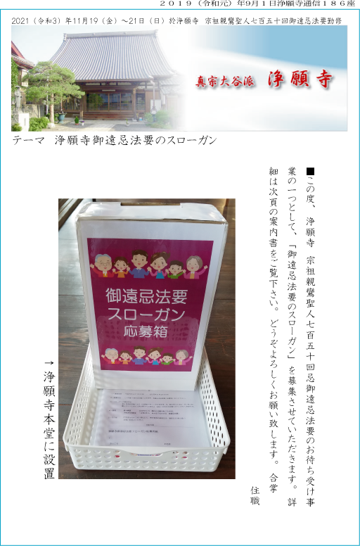 この度、浄願寺 宗祖親鸞聖人七百五十回御遠忌法要のお待ち受け事業の一つとして、「御遠忌法要のスローガン」を募集させていただきます。詳細は下の案内書をご覧下さい。どうぞよろしくお願い致します。(浄願寺本堂に設置)