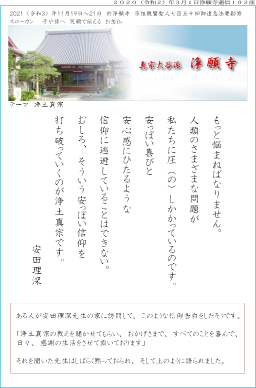 ▼今回また繰り返し表紙の言葉を紹介致しました。言うまでもなく、打ち破っていく のは浄土真宗であって(他力)、私が打ち破っていく(自力)のではありません。そう言えば去年、浄願寺の永代経法要でも、日野直(ひのすなお)さんが読み上げてくださいました。今年は3月8(日)10:00〜 13:30〜です。ぜひお参りください。