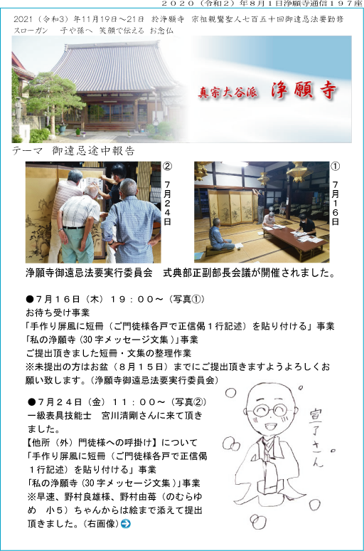 ▼毎年、湖北では7月2日〜10日長浜別院に於いて、8月5日〜10日五村別院に於いて計15日間、「夏中(げちゅう)さん」が勤まり「夏(げ)の御文」が拝読されます。しかし、今年はコロナウイルスのため、7月6日〜9日長浜別院に於いて、8月5日〜8日五村別院に於いて縮小して勤まります。