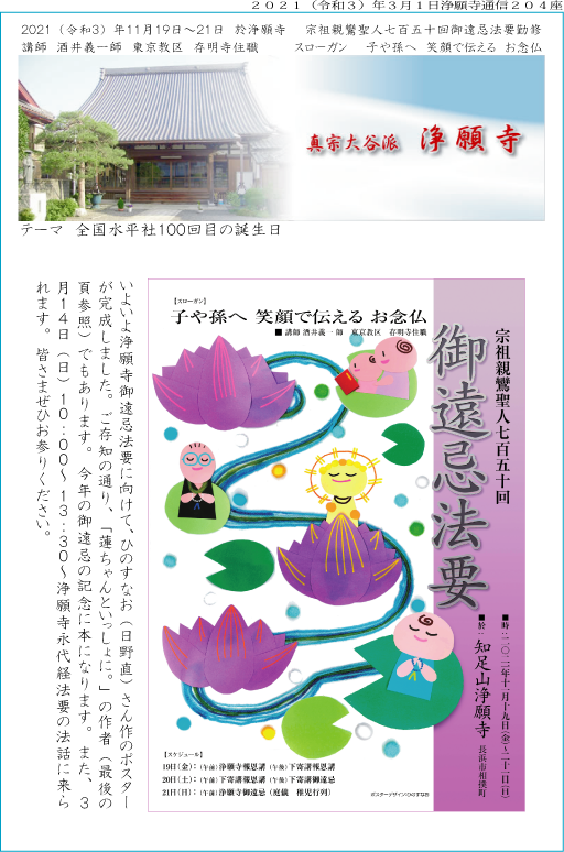 いよいよ浄願寺御遠忌法要に向けて、ひのすなお(日野直)さん作のポスターが完成しました。ご存知の通り、「蓮ちゃんといっしょに。」の作者(最後の頁参照)でもあります。今年の御遠忌の記念に本になります。また、3月14日(日)10:00〜 13:30〜浄願寺永代経法要の法話に来られます。皆さまぜひお参りください。