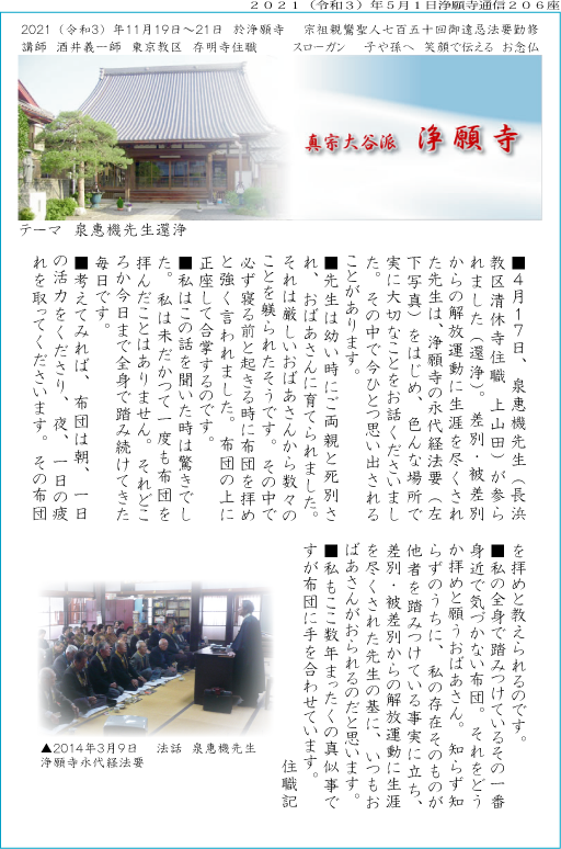 ■4月17日、泉惠機先生(長浜教区清休寺住職 上山田)が参られました(還浄)。差別・被差別からの解放運動に生涯を尽くされた先生は、浄願寺の永代経法要(下写真)をはじめ、色んな場所で実に大切なことをお話くださいました。その中で今ひとつ思い出されることがあります。