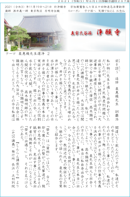 ▼4月17日、泉惠機先生(長浜教区清休寺住職 上山田)がお浄土に還られました。前号に引き続き、テーマ「泉惠機先生還浄 2」とさせて頂きました。浄願寺の永代経法要でも「大逆事件」のことを力強く語られたことを思い出します。