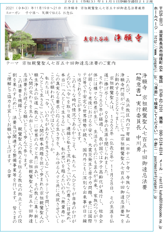 浄願寺 宗祖親鸞聖人七百五十回御遠忌法要 【趣意書】 実行委員長 中川勇