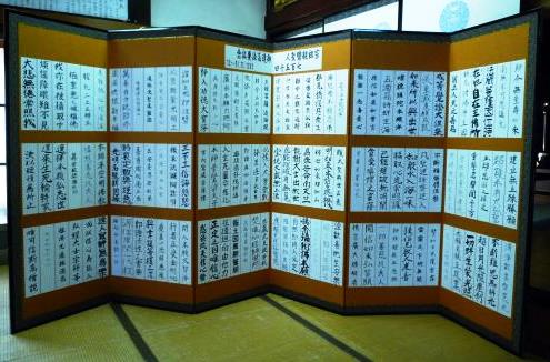 ご門徒各戸の皆様に勤行集(正信偈)百二十句の内、実行委員会が割振りした一句を短冊に記述して頂き、ご門徒様提供の屏風に粘り付けました。その後のお寺行事の際にご覧頂いています。(同 冊子より)