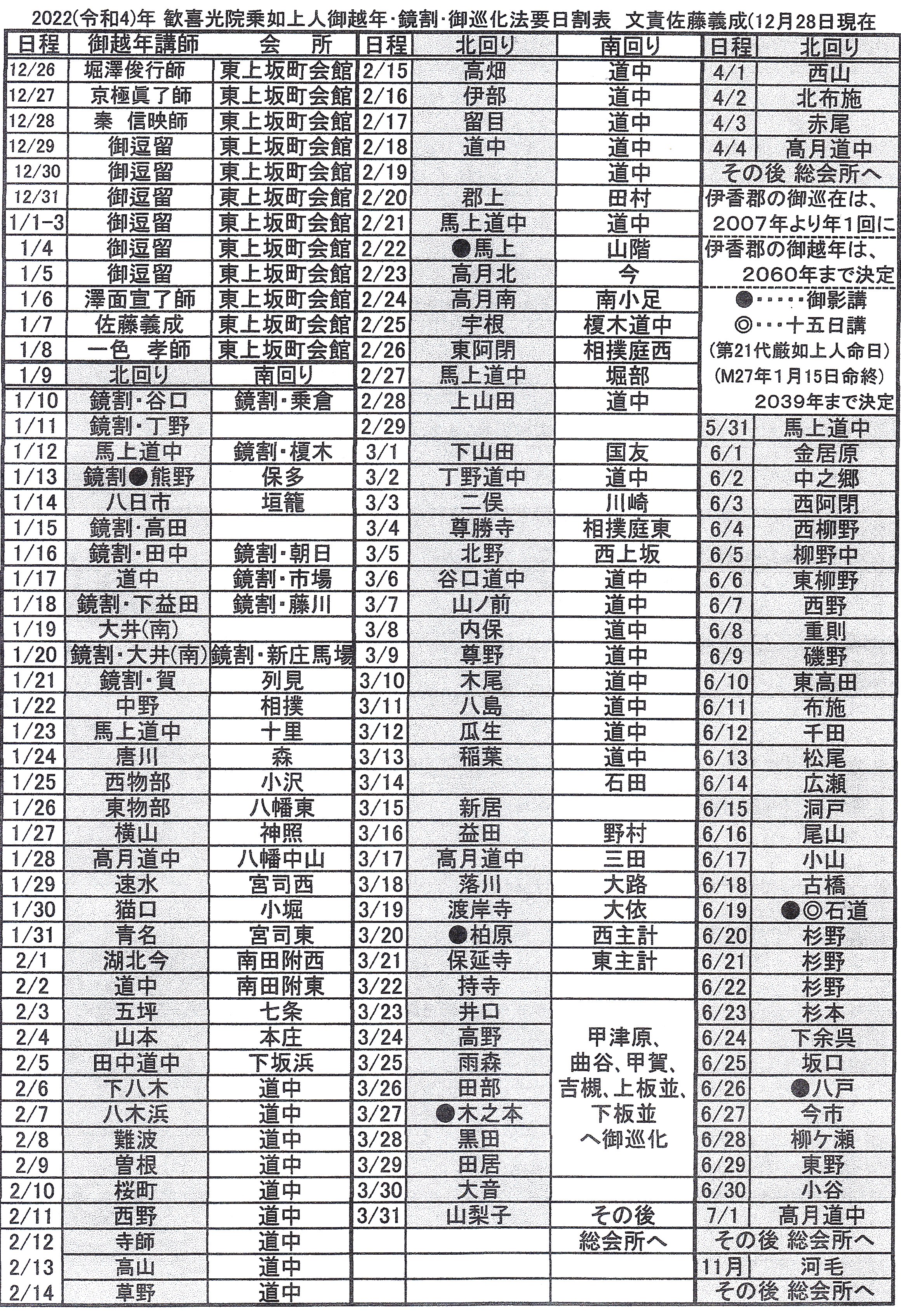 「御越年法要」はこの組織の一から六の順序でお勤まりになり、その後、一から三の組織で一幅の御影が、四から六の組織であと一幅の御影が御巡在になりますが、「鏡割りお講」は各組織のそれぞれ数カ所(概ね旧村落)で、営まれ、そのあと各集落への御巡在となる訳であります。