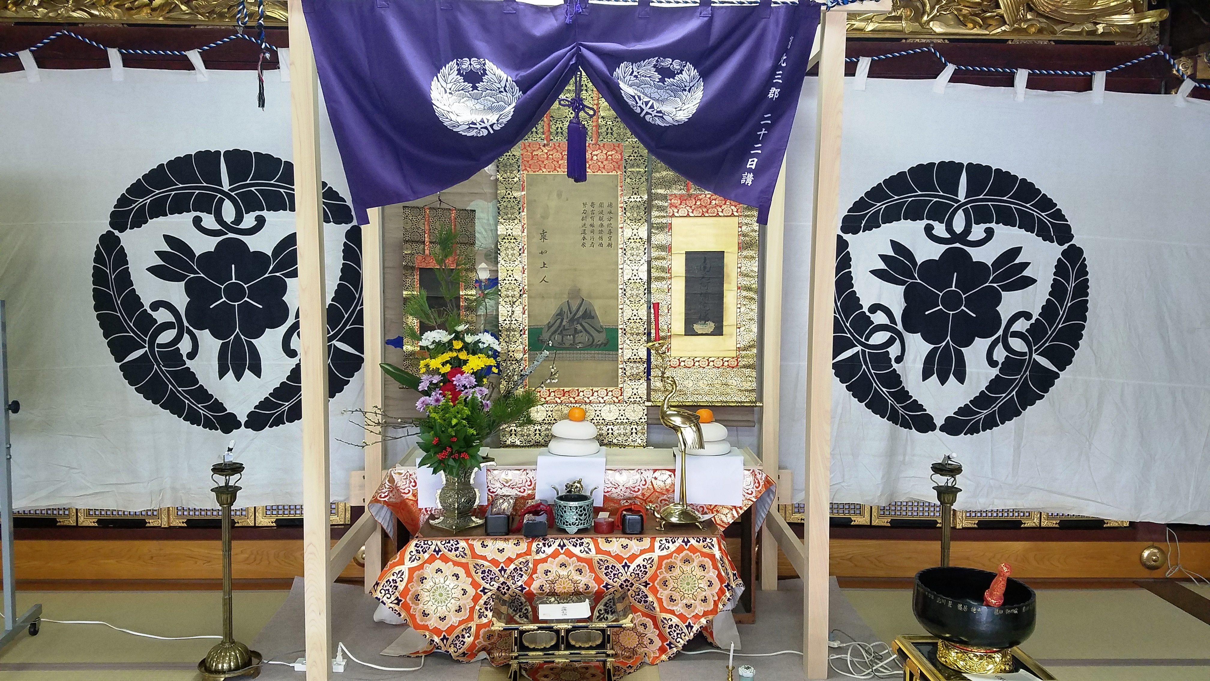 毎年十二月二十六日から翌一月八日まで、二幅の御影を双懸(そうけん)して「御越年(ごおつねん)法要」が営まれ、参詣された各組の代表者がここで供えられたお鏡(二十四枚)を分けて頂いて帰り、これに餅米をつき混ぜ「鏡割り法要」を厳修し、この御座にお参りした各集落の世話方は、頂いたお鏡に更に餅米をつき混ぜて必要な量のお鏡やお華来を作り、集落毎の「御巡化(ごじゅんけ)法要」をお勤めしてお供えを各戸に配られる仕組みになっています。