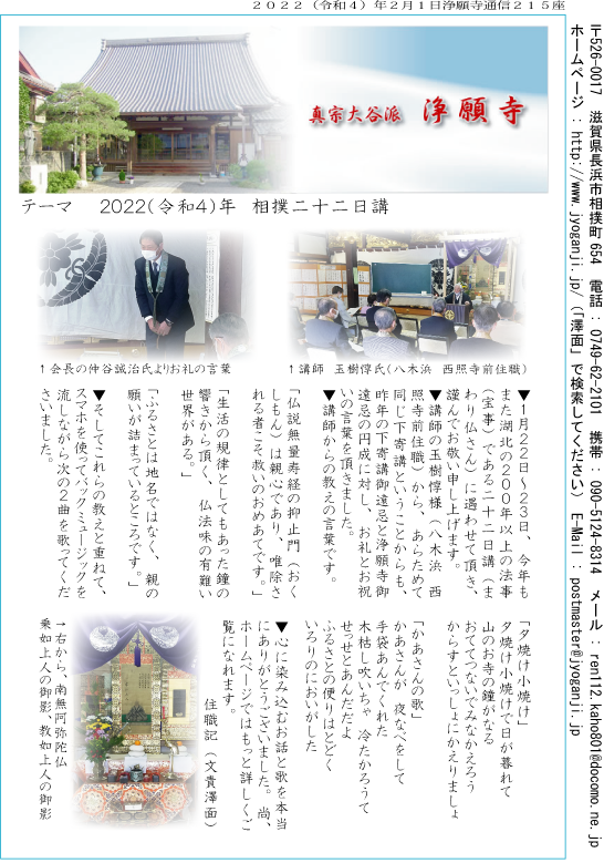 ▼1月22日〜23日、今年もまた湖北の200年以上の法事(宝事)である二十二日講(まわり仏さん)に遇わせて頂き、謹んでお敬い申し上げます。