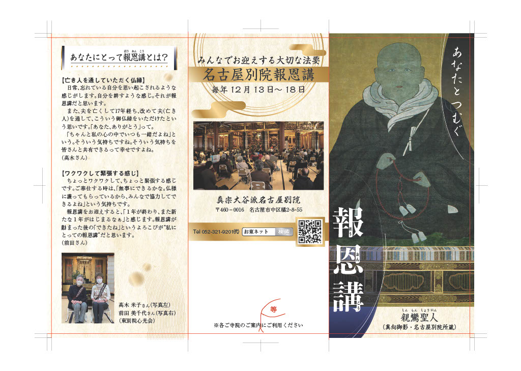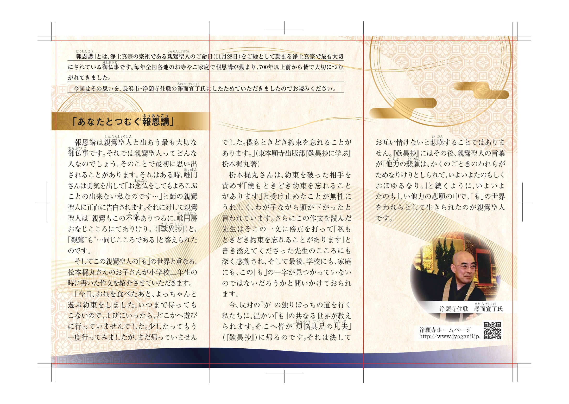 ▼4頁はつい先日、名古屋別院発行のリーフレット「あなたとつむぐ報恩講」に書かせて頂いた文章です。下参照