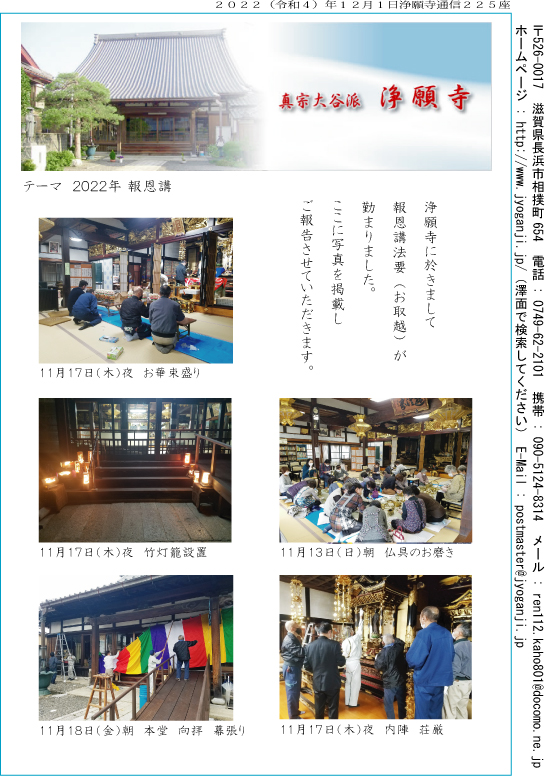 11月18日(金)から11月20日(日)、浄願寺に於きまして報恩講法要(お取越)が勤まりました。ここに写真を掲載しご報告させていただきます。合掌
