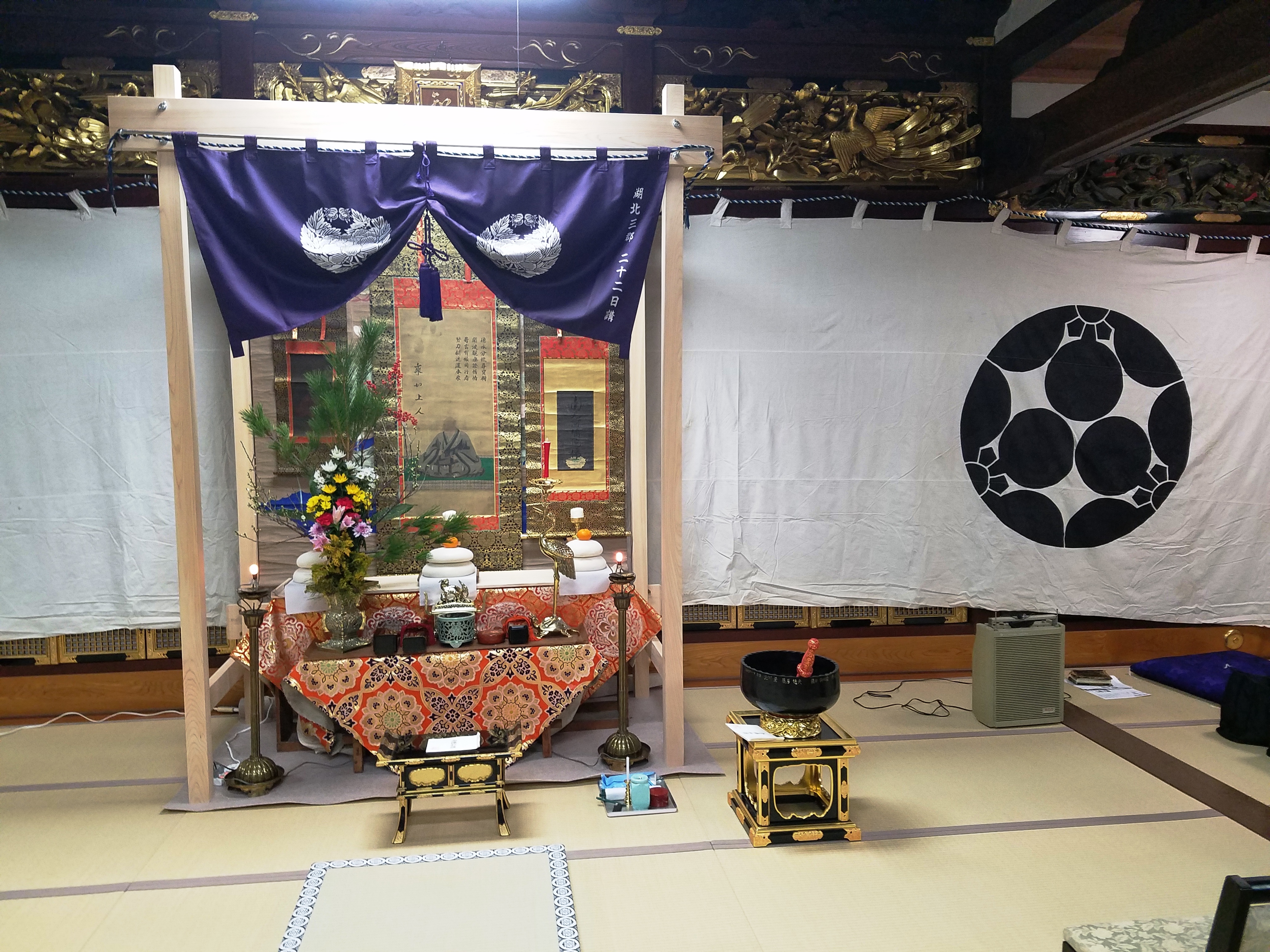 毎年十二月二十六日から翌一月八日まで、二幅の御影を双懸(そうけん)して「御越年(ごおつねん)法要」が営まれ、参詣された各組の代表者がここで供えられたお鏡(二十四枚)を分けて頂いて帰り、これに餅米をつき混ぜ「鏡割り法要」を厳修し、この御座にお参りした各集落の世話方は、頂いたお鏡に更に餅米をつき混ぜて必要な量のお鏡やお華来を作り、集落毎の「御巡化(ごじゅんけ)法要」をお勤めしてお供えを各戸に配られる仕組みになっています。