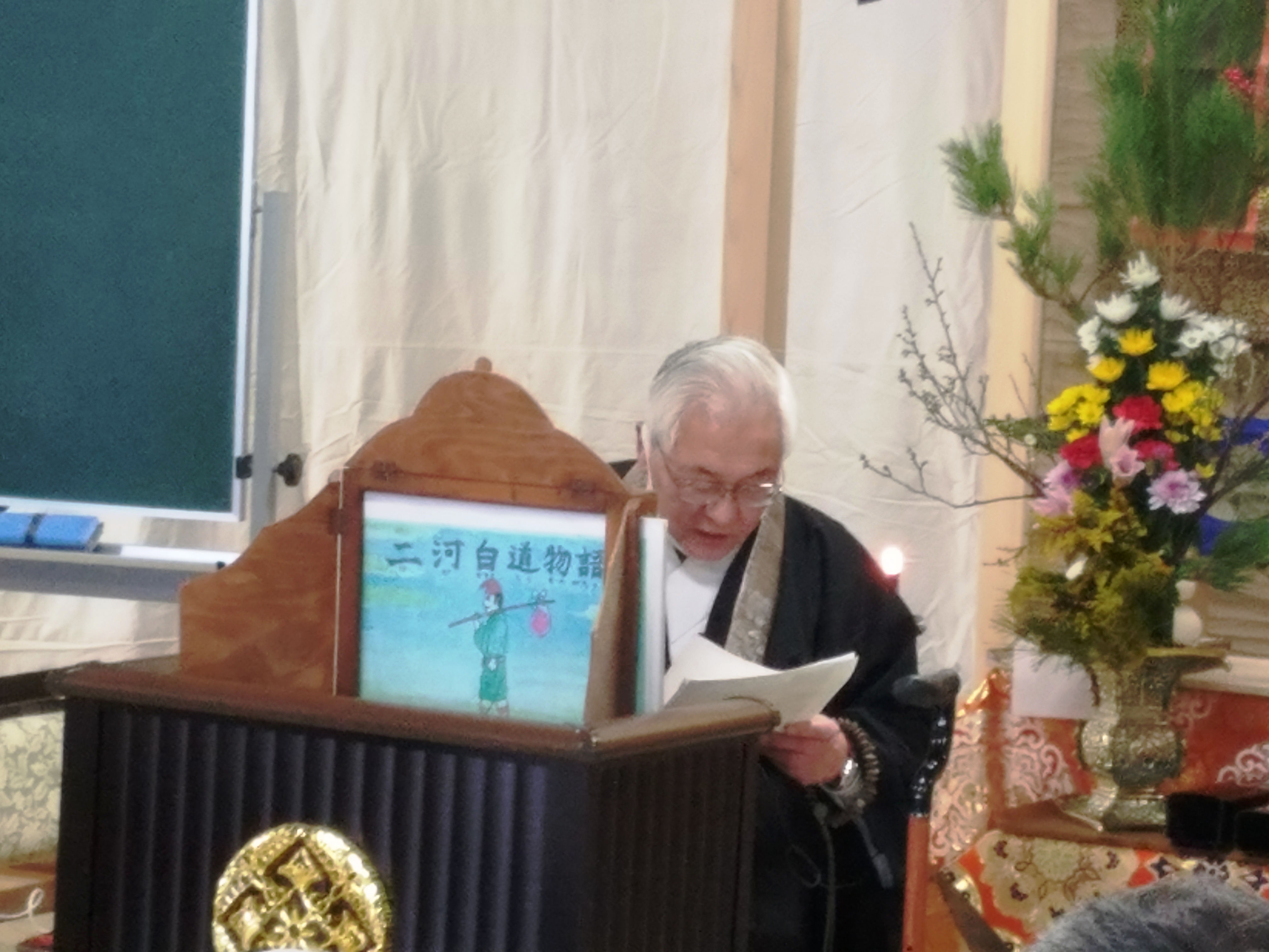 また、教えと重ねて「二河白道物語」と「月の神様になったうさぎ」の紙芝居をしてくださり、そして「神照小学校校歌」と「野に咲く花のように」(※下歌詞)を歌ってくださいました。