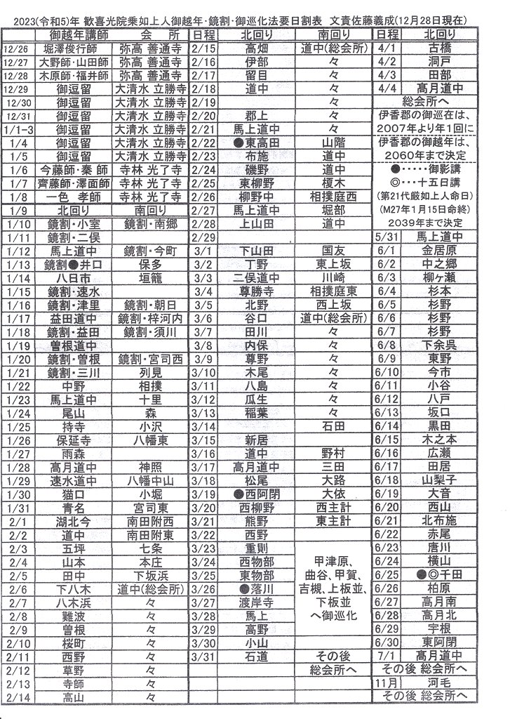 「御越年法要」はこの組織の一から六の順序でお勤まりになり、その後、一から三の組織で一幅の御影が、四から六の組織であと一幅の御影が御巡在になりますが、「鏡割りお講」は各組織のそれぞれ数カ所(概ね旧村落)で、営まれ、そのあと各集落への御巡在となる訳であります。