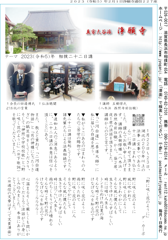 1月22日〜23日、湖北の200年以上の法事(宝事)である二十二日講(まわり仏さん)に遇わせて頂きました。謹んでお敬い申し上げます。講師の玉樹惇様(八木浜・西照寺前住職)から、昼2席、夜1席の法話を頂きました。