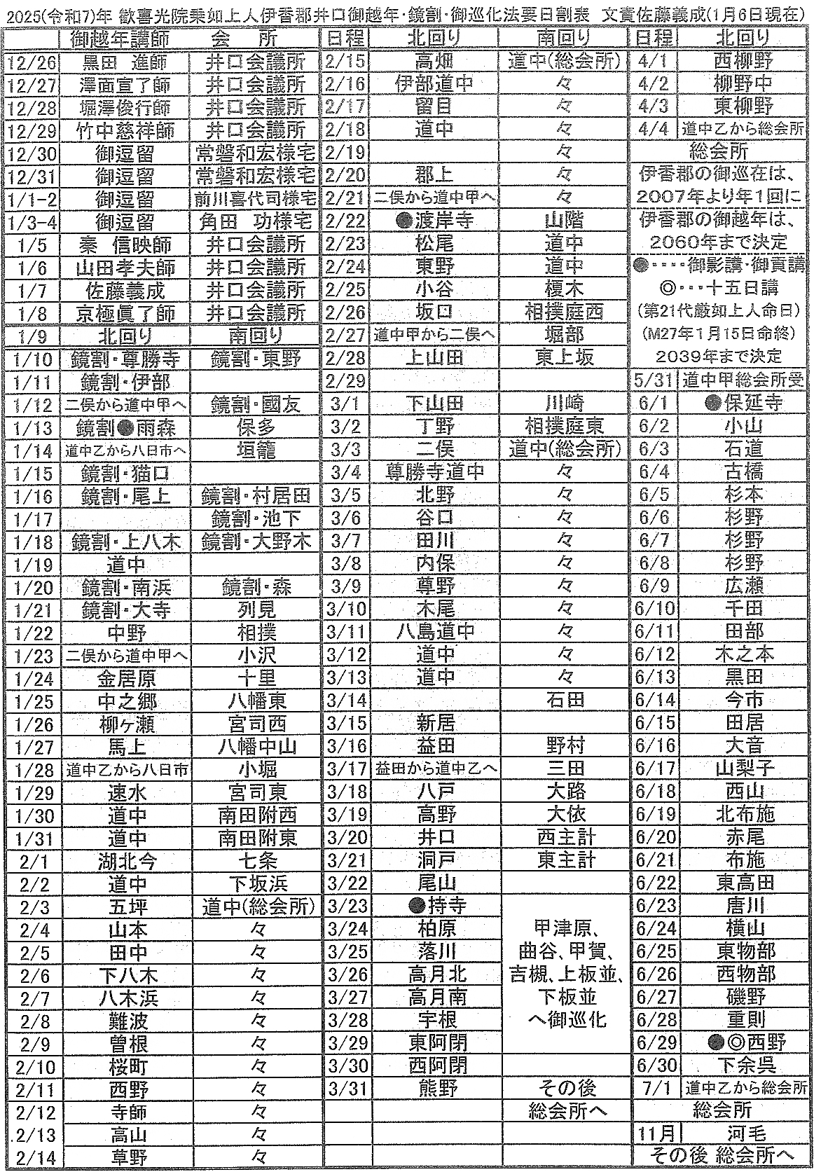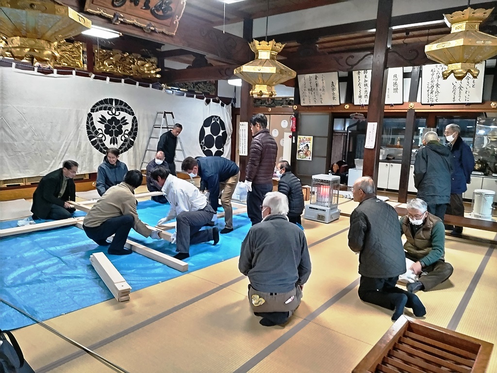 「御越年法要」はこの組織の一から六の順序でお勤まりになり、その後、一から三の組織で一幅の御影が、四から六の組織であと一幅の御影が御巡在になりますが、「鏡割りお講」は各組織のそれぞれ数カ所(概ね旧村落)で、営まれ、そのあと各集落への御巡在となる訳であります。