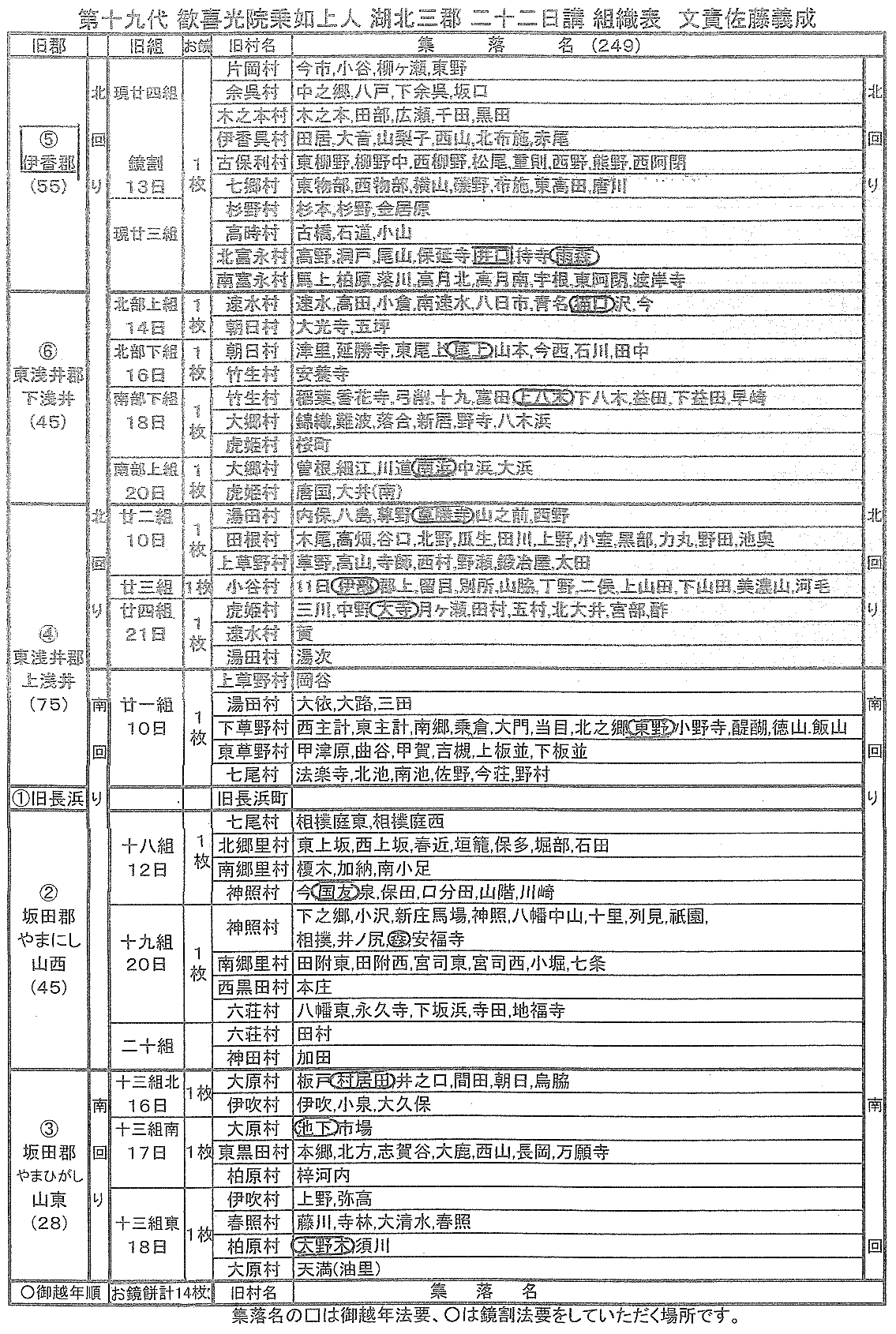 二十二日講の組織は湖北一市三郡を六つの地区に分けて構成されています。