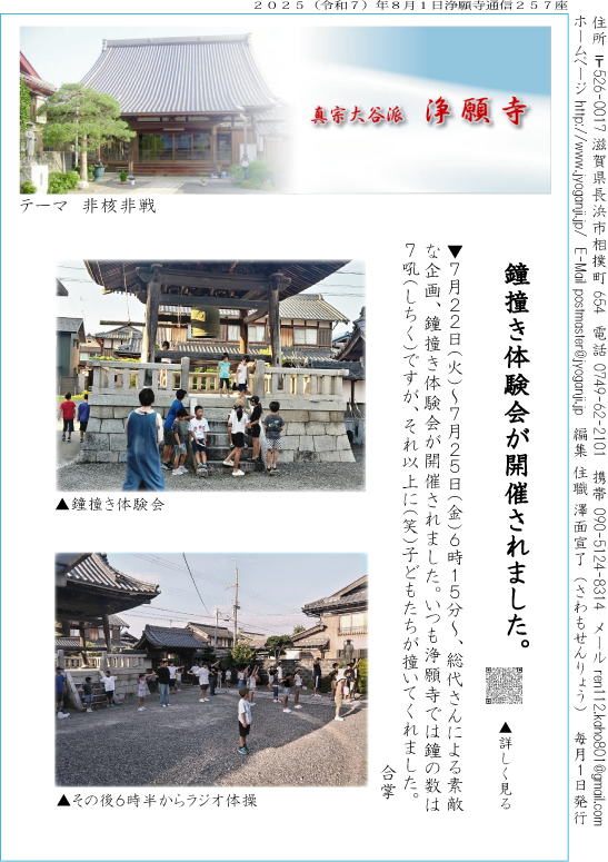 ▼表紙の鐘撞き体験会は、お寺への親近感を持ってもらいたいという役員さんの願いからこのように開催されました。ありがとうございました。