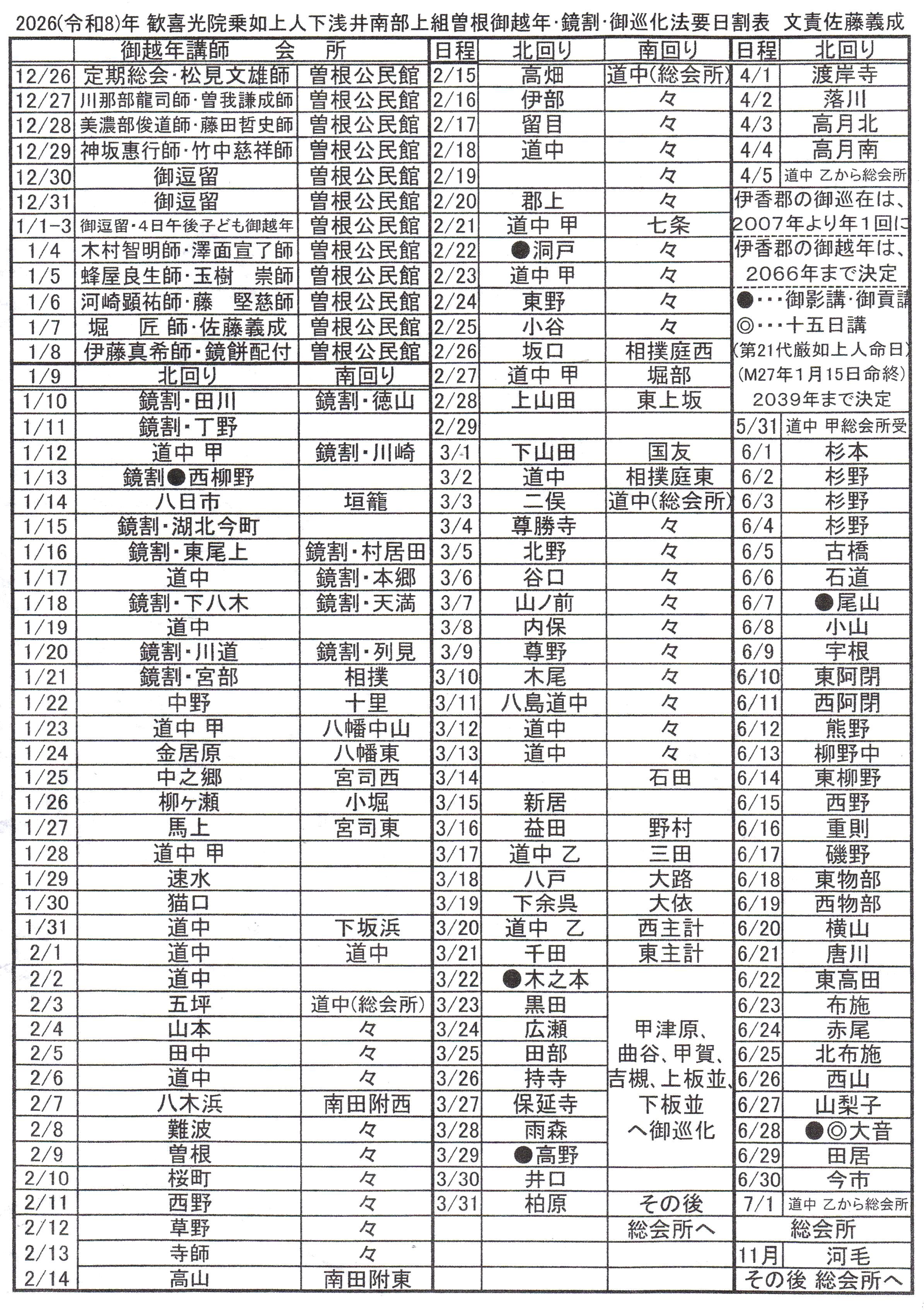 毎年十二月二十六日から翌一月八日まで、二幅の御影を双懸(そうけん)して「御越年(ごおつねん)法要」が営まれ、参詣された各組の代表者がここで供えられたお鏡(二十四枚)を分けて頂いて帰り、これに餅米をつき混ぜ「鏡割り法要」を厳修し、この御座にお参りした各集落の世話方は、頂いたお鏡に更に餅米をつき混ぜて必要な量のお鏡やお華来を作り、集落毎の「御巡化(ごじゅんけ)法要」をお勤めしてお供えを各戸に配られる仕組みになっています。