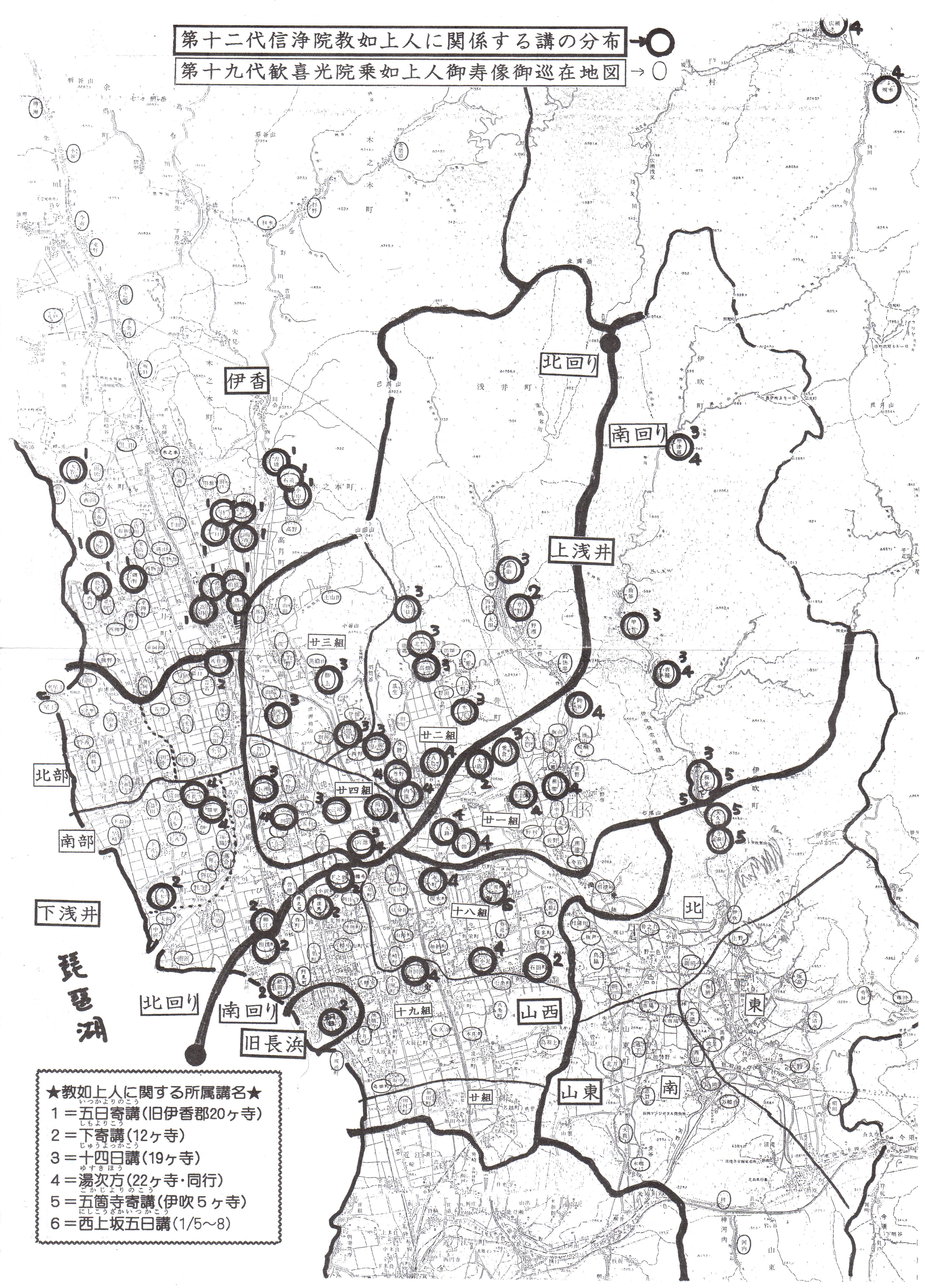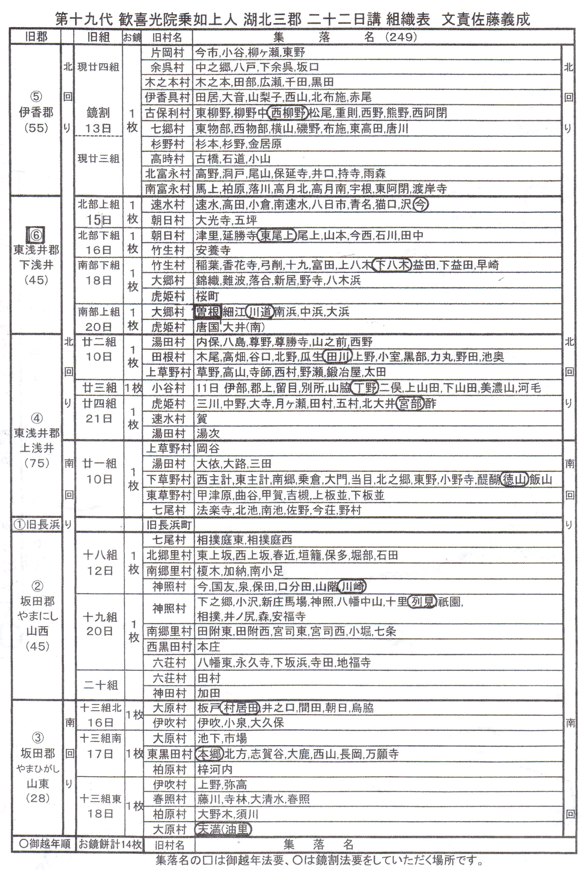 二十二日講の組織は湖北一市三郡を六つの地区に分けて構成されています。