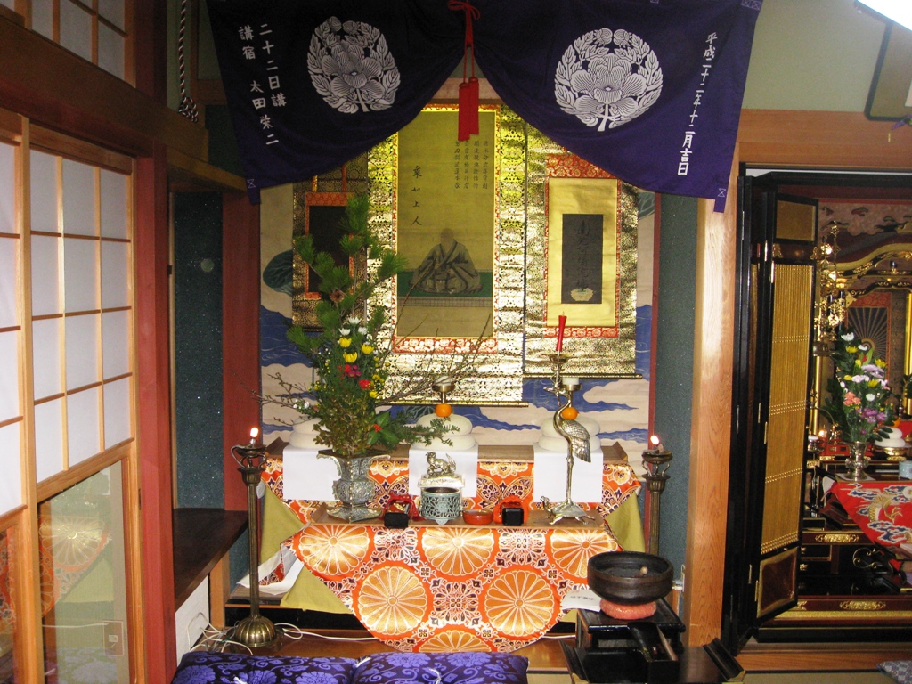 ↑お内仏(仏壇)の横、床の間に右から、南無阿弥陀仏、乗如上人、教如上人の御影