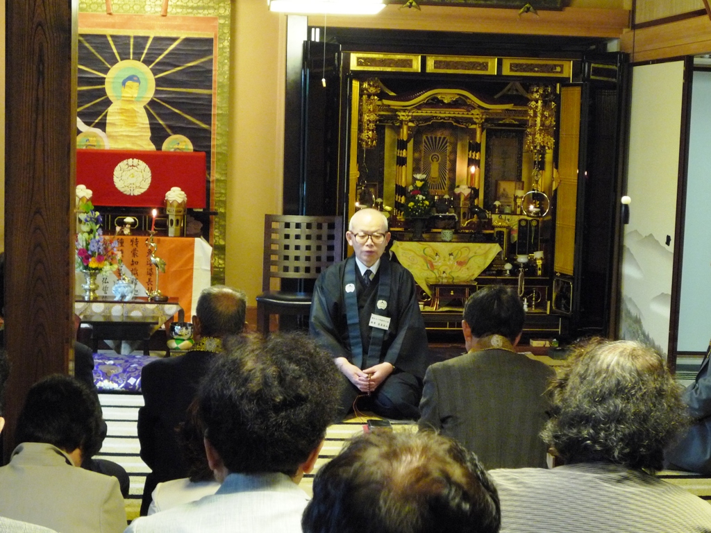 中川(二)様宅にてお勤めの後、随行教導より法話です。(8:10撮影)