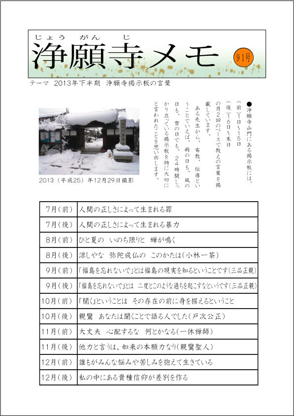 ●91号では、2013年7月〜12月までの浄願寺掲示板の言葉を掲載しました。