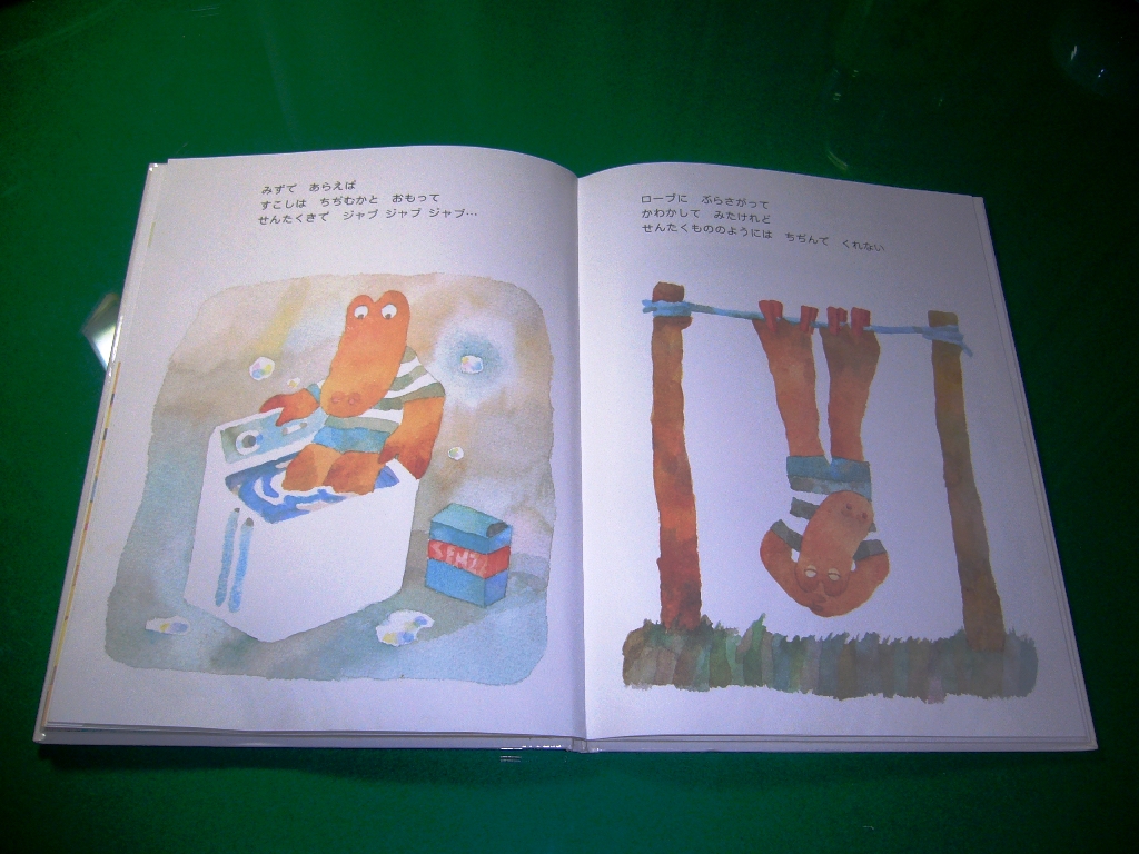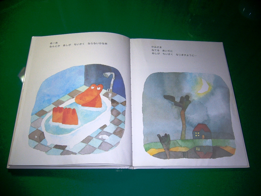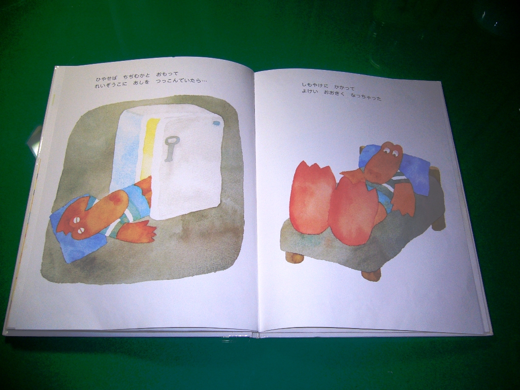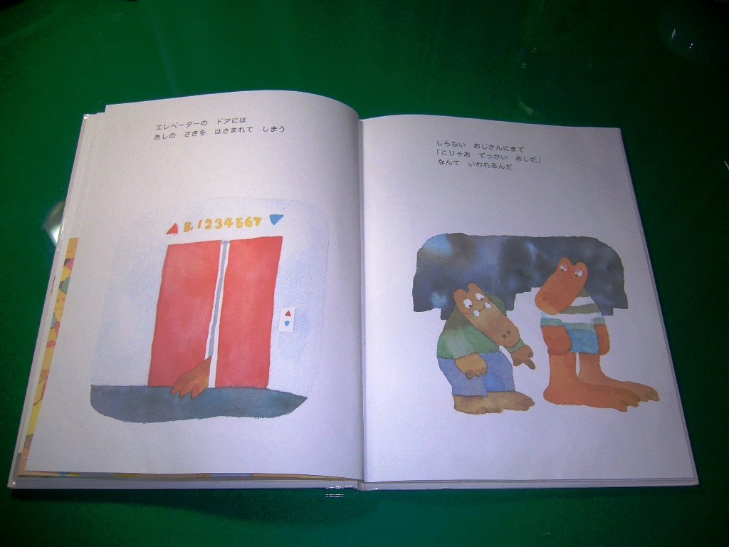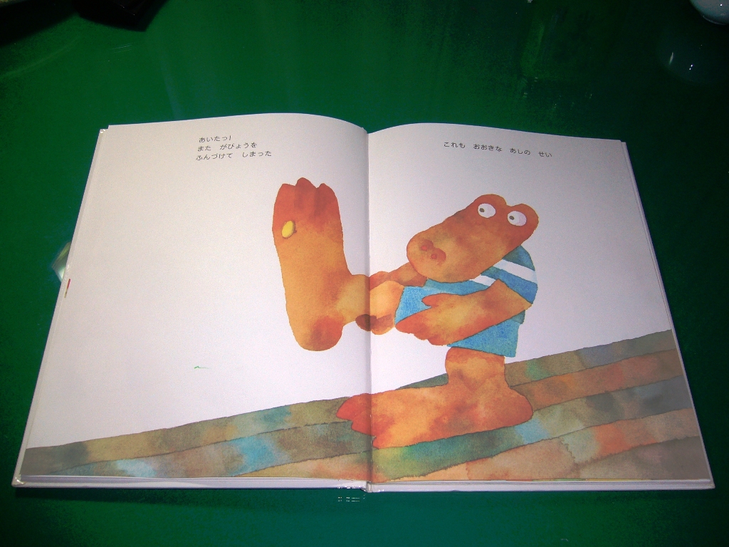 次に「ワニくんのおおきなあし」という絵本を紹介したいと思います。このワニくんは足が大きいというのが悩みなんです。何とか足が小さくなるようにって励んでいるんですが…。読みますね。