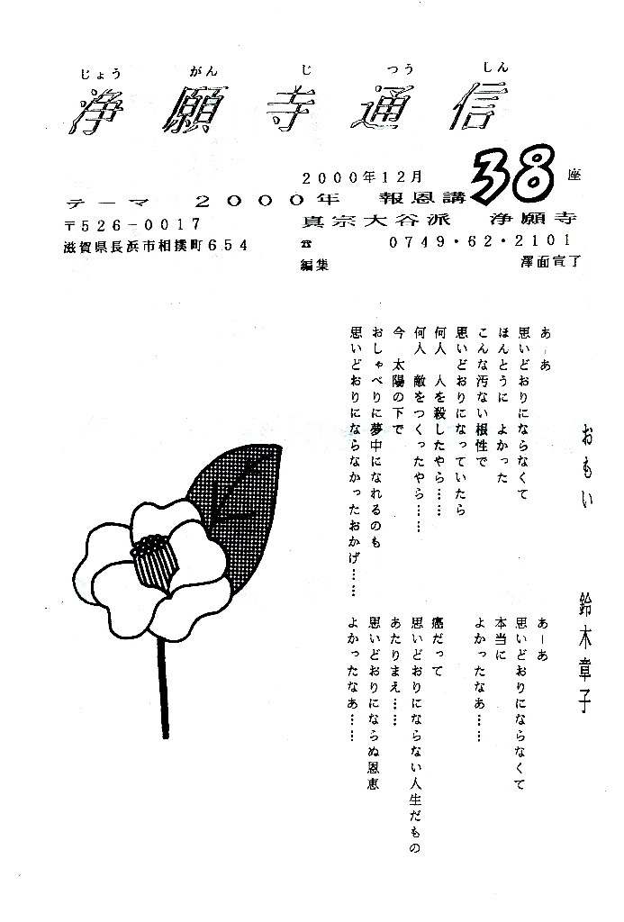 その他にも、山階誠さん(泉町 了願寺副住職)杉田真一さん(大阪 即応寺衆徒)照井静志さん(長浜教務所)にもご参勤頂きました。こんなふうに、二〇〇〇年も親鸞聖人に集う報恩講に遇わさせて頂きました。準備から多様なお世話して下さいました総代さま方、婦人会の方、子ども報恩講に際して、お菓子を下さいました藤居吉男様、そして皆さま方、ありがとうこざいました。