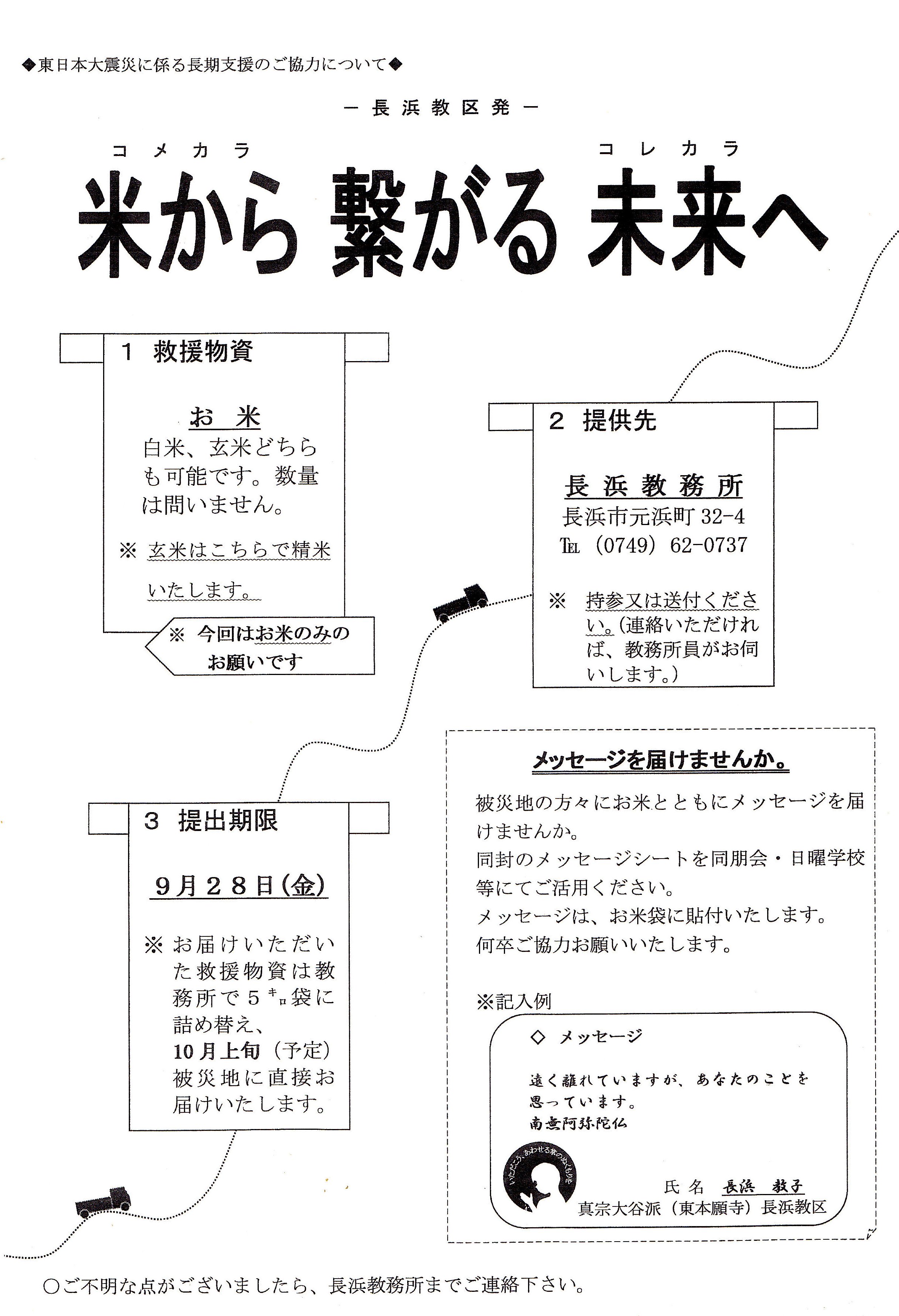▼今年3月、長浜教区から東北地方太平洋沖地震で被災された方々にお米と飲料水が届られました。(詳細は浄願寺メモ84号参照)その第2便のご案内です。(下参照)今回はお米のみです。