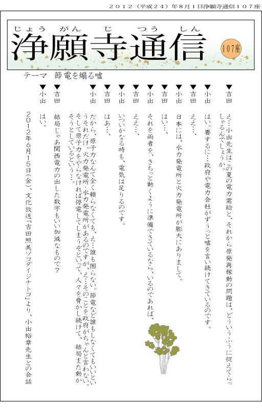 ▼繰り返しますが、節電は二の次ということでは決してありません。そのことも、小出裕章先生が著作である『原発のウソ』でこのように書いておられます。「安全な地球環境を子どもや孫に引き渡したいのであれば、「知足」しかありません。まずはエ不ルギー消費の抑制にこそ目を向けなければなりません。」ちなみに小出裕章先生は11月10日(土)午後1時半、五村別院にお話に来られます。ぜひお参りください。