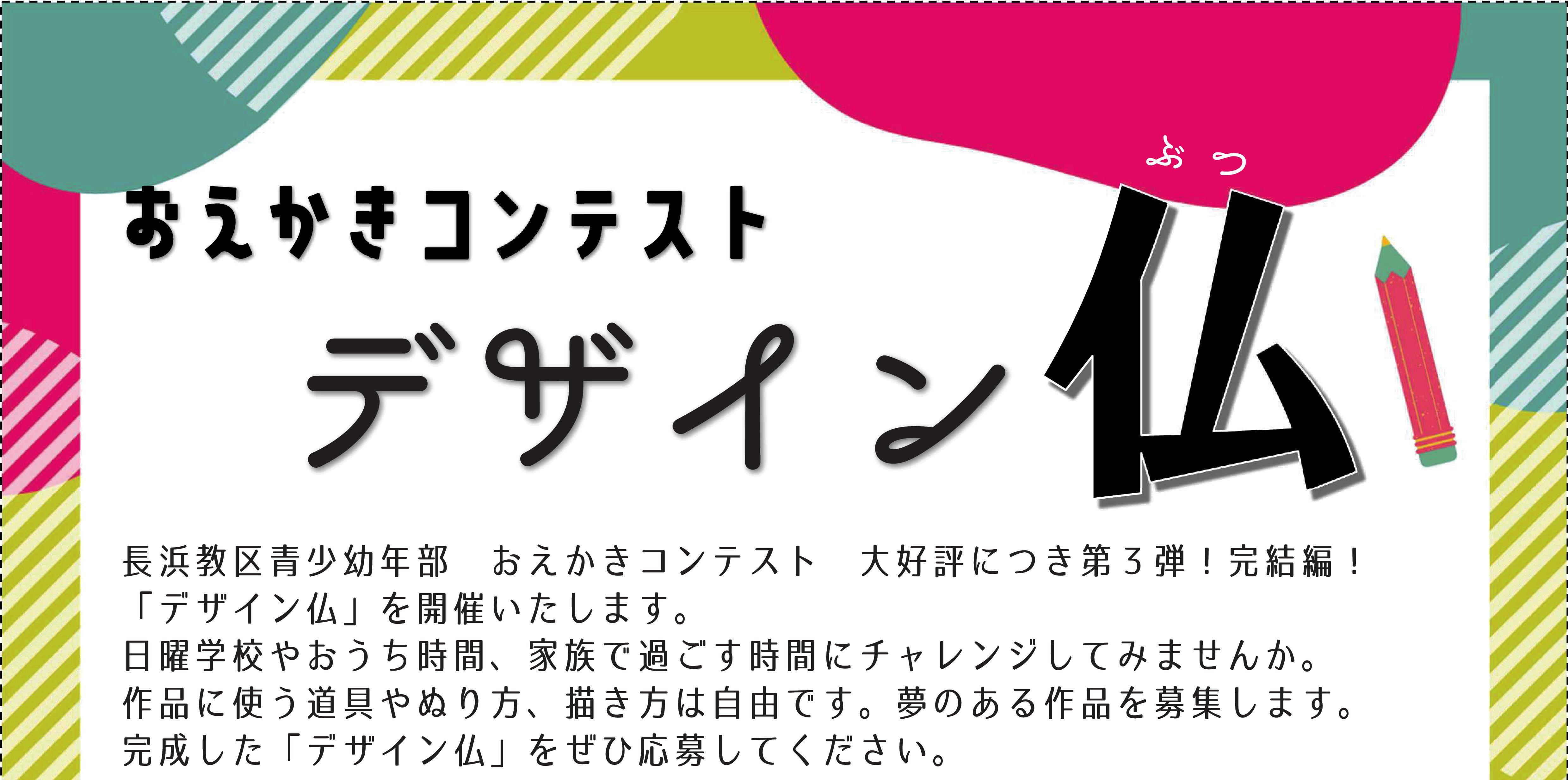 ※3 別紙の所定用紙に、色鉛筆、クレヨン ペンなど自由な発想で作品を完成させてください。長浜教務所から参加者全員にプレゼントがあります。前回の「デザインアミダ」の時と同じく、浄願寺本堂入口に貼らせて頂き(※右画像)、浄願寺通信、ホームページに掲載させて頂きます。詳しくは住職まで、ぜひ皆々様、お待ちしています。