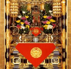須弥壇(しゅみだん)の上に阿弥陀如来を安置する佛殿(ぶつでん)。