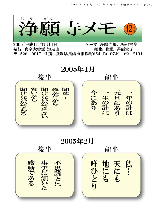 ●42号では、2005年1月〜4月までの浄願寺掲示板の言葉を掲載しました。