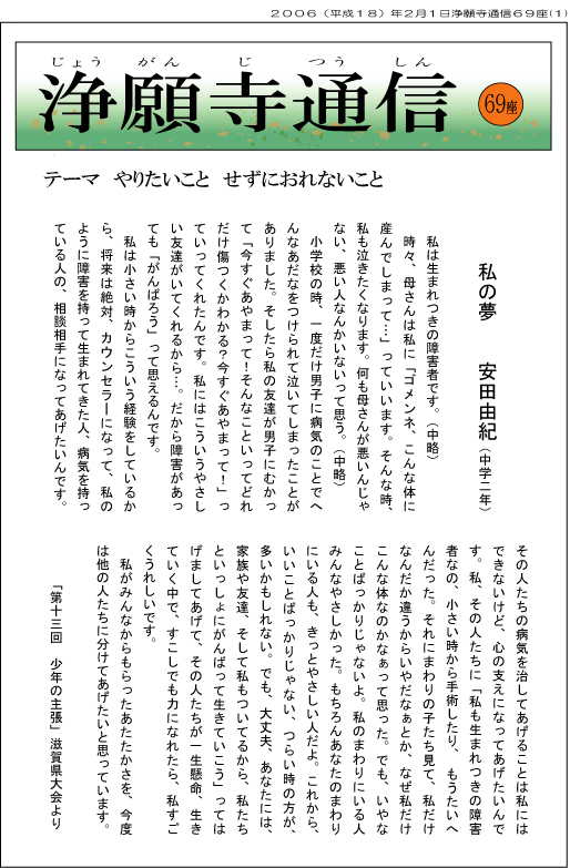 ▼私にはまだ、この言葉の深い意味がわかりかねるのですが、表紙の文章と重ねてみると、ひとつ思うことがあります。「私の夢」を描く安田由紀さんは、やりたいことというより、せずにおれないこととして、自分の夢を語っておられます。考えてみると、やりたいことというのは、所詮、どこまでも個人的なことでしかありません。それに対し、せずにおれないことというのは、相手から引き出されてくるという、そんな次元のことであり、両者の決定的な違いは、そこに人が見えているかどうかなのですよね。