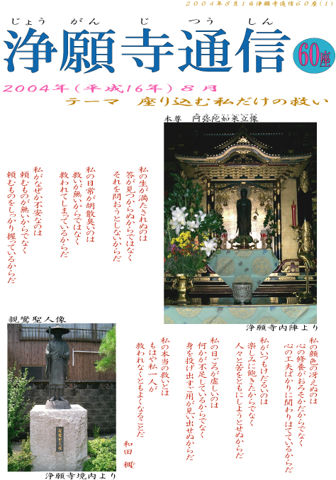 ▼最近よく、私は私でよかったと思えることが救いであると聞かされます。確かにそのことは大切なことなのですが、ただ、どうでしょうか、日常、そんなふうに思えるのは、やはり、思い通りになってしめしめという、そんな感覚が強いのではないかと思うのです。私は私でよかったと、座り込む私だけの救いが今、本尊と親鸞聖人から問われてきます。あらためて表紙の言葉と、次の言葉を頂き直したいと思います。