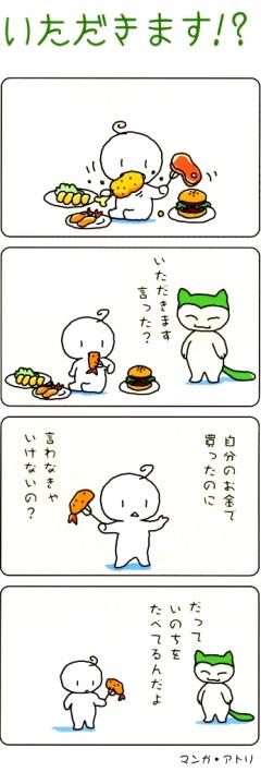 に対して、ほとんどの大人が異口同音にこの子に注意をすると思います。しかし、いのちを「食材」などと呼び、グルメにうつつを抜かす私たち大人は、四コマ目のセリフ、