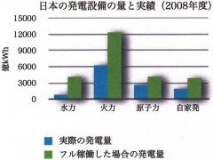 日本では、全発電量の約3割を原子力発電が担っているとされ、原子力が不可欠のように考えられてきました。しかし、水力、火力、原子力、共に言えることですが、発電所をフル稼働した場合の発電量と、実際の発電量には、かなりの開きがあります。というのも、発電所設備自体が過剰とも言える状態で、年間の発電設備利用率は、水力19%、火力50%(2008年度)であり、まだまだ発電能力には余力のある状態となっているからです。つまり、原子力発電をやめたとしても、水力、火力発電で十分補っていくことが可能なのです。私たちが一般的に聞かされている「全発電量約3割を原子力発電が担っている」という情報は、実際の発電量の割合のことを言っているので、そのことが「原発は廃止出来ない」等の誤解を生む原因になっているようです。