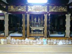 ▲集まったお米と飲料水は浄願寺本堂にお供えします。2012(平成24)年3月19日