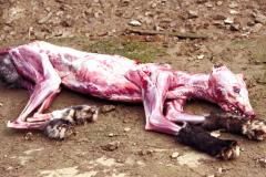 写真は、JAVA(NPO法人動物実験の廃止を求める会)のホームページに掲載されていたもので、人間の着る毛皮のコートのために皮を剥がされたキツネの死体です。同じページに次のように書かれてあります。