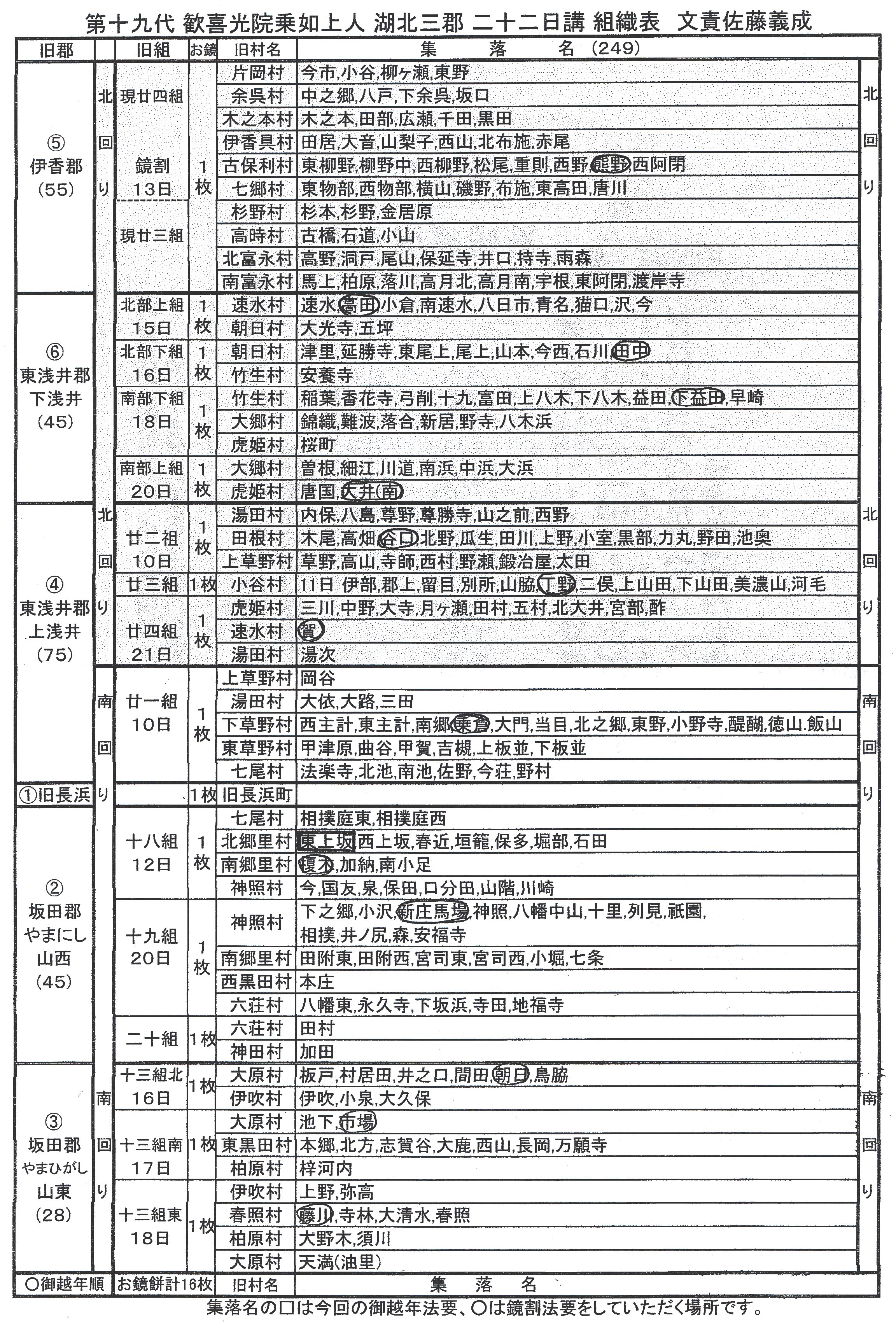 第十九代 歓喜光院乗如上人 湖北三郡 二十二日講 組織表