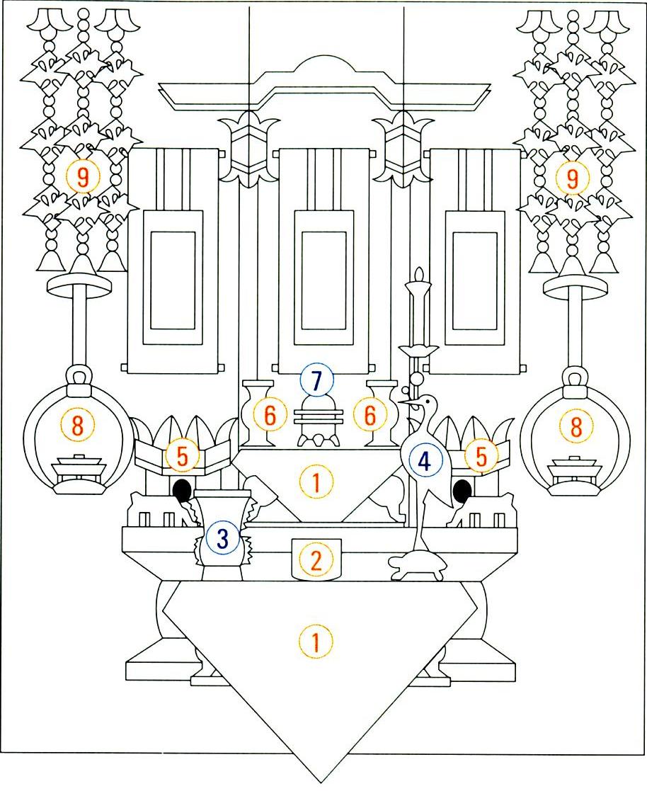 1打敷(うちしき) 2土香炉(どごうろ) 3花瓶(かひん) 4鶴亀(つるかめ) 5供笥(くげ) 6華瓶 (けびょう) 7火舎香炉(かしゃごうろ) 8輪灯(りんとう) 9瓔珞(ようらく)※湖北では「ゆうらく」とよぶ方もありますが正しくは「ようらく」です。