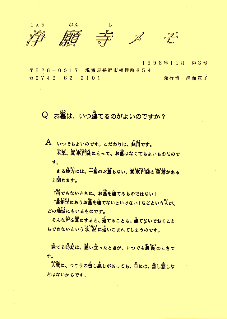いつでもよいのです。こだわりは無用です。本来、真宗門徒にとって、お墓はなくてもよいものなのです。ある地方には、一基のお墓もない、真宗門徒の集落があると聞きます。