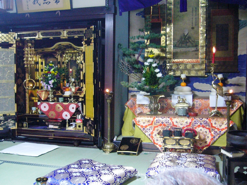 ↑お内仏(仏壇)の横、床の間に右から、南無阿弥陀仏、乗如上人、教如上人の御影をお掛けします。