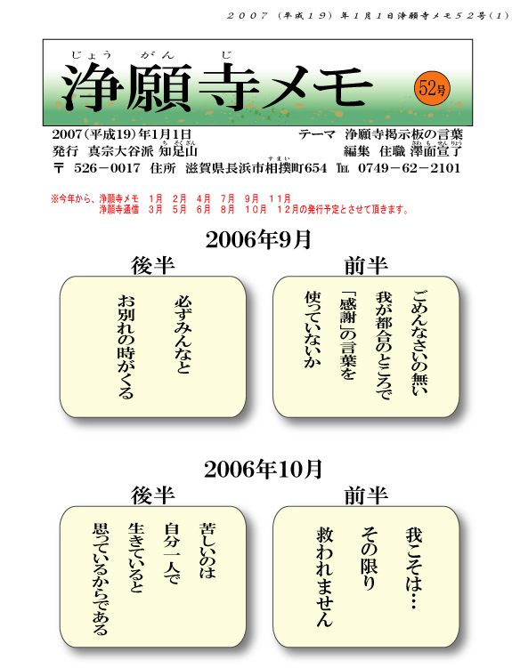 ●52号では、2006年9月〜12月までの浄願寺掲示板の言葉を掲載しました。