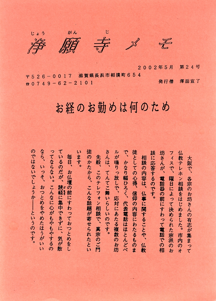 真宗のおつとめは、死者に回向したり、ご祈祷したり、精神修養のためにするものでなく、お釈迦さまのお説法(浄土三部経)や、宗祖のお念仏のおあじわい(正信偈・和讃)を、繰り返し拝読することによって、み仏の徳をたたえ、お念仏の信心をよろこぱせていただく報謝です。