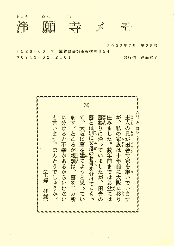 主人の兄が田舎で家を継いでいますが、私の家族は十年前に大阪に移り住みました。数年前まではお盆には墓参りに帰っていましたが、田舎の墓とは別に父母のお骨を分けてもらって、大阪に墓を建てようと思っています。ところか親類は、墓を2ヵ所に分けると不幸かあるからいけないと言います。ほんとうでしょうか。(主婦48歳)