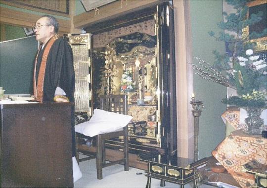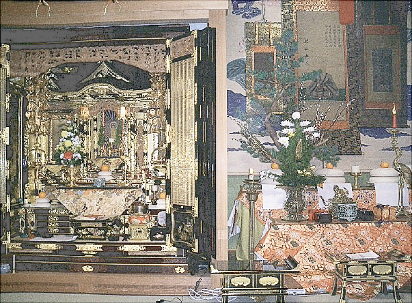 ↑お内仏(仏壇)の横、床の間に右から、南無阿弥陀仏、乗如上人、教如上人の御影をお掛けします。