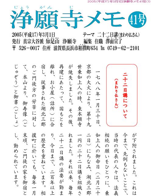 こうして、湖北二市二郡全ての御門徒が二十二日講の御縁にお遇いすることが出来るようになっています。今日、私たちはこの勝縁に遇い、乗如上人の御苦労、我がご先祖のご苦労と喜びの姿を偲びつつ、更に二百有余年連綿と伝えられてきた法悦の歴史を感じて、掌を合わす我が身の誇りと幸せを噛みしめたいものであります。