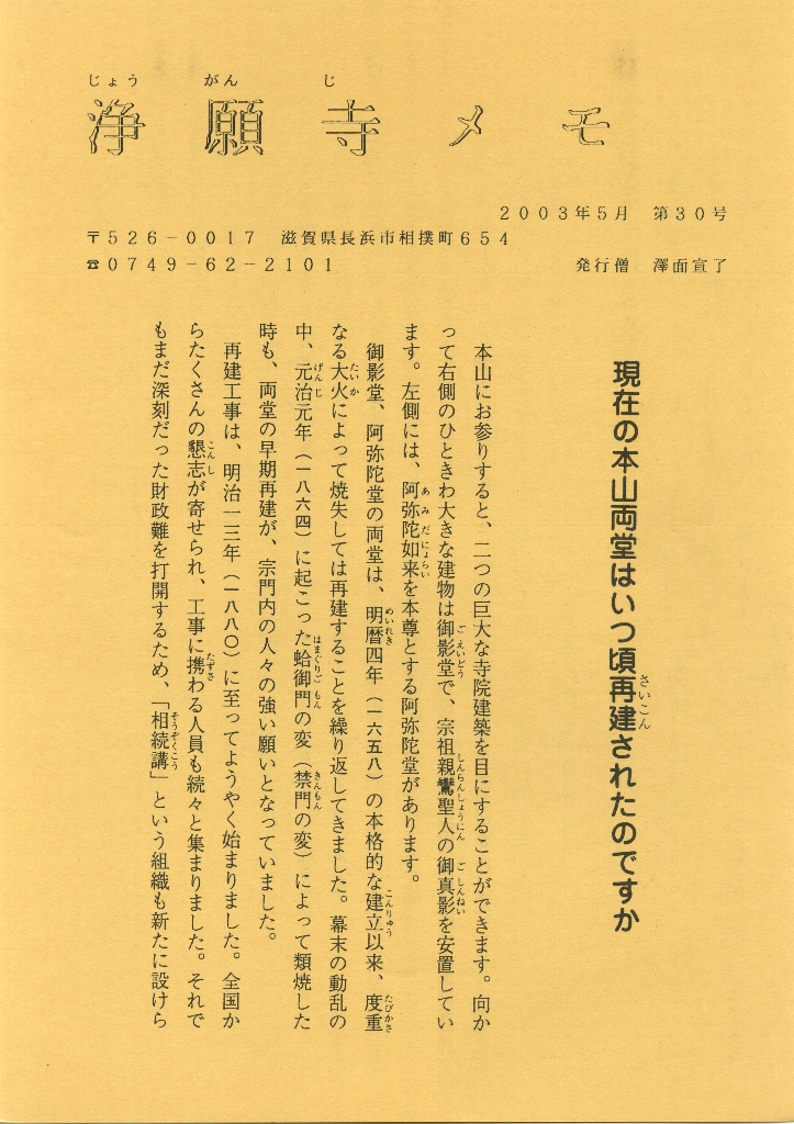 再建工事は、明治一三年(一八八〇)に至ってようやく始まりました。全国からたくさんの懇志が寄せられ、工事に携わる人員も続々と集まりました。それでもまだ深刻だった財政難を打開するため、「相続講」という組織も新たに設けられました。相続講は、念仏の教えの相続と、本山の護持を意図して、今日まで続いています。
