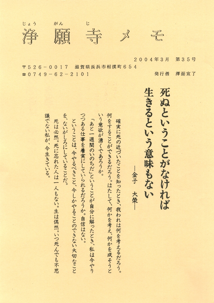 本夛先生がよく言われていた「人生は出遇いだよ」という言葉をかみしめての、三月号の浄願寺メモと今号の浄願寺通信です…。