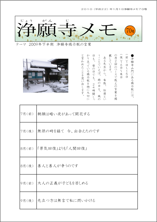 ●70号では、2009年7月〜12月までの浄願寺掲示板の言葉を掲載しました。